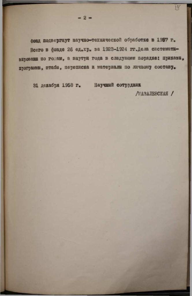 Фонд подвергнут научно-технической обработке в 1957 г. Всего в фонде 26 ед. хр. за 1923-1924 гг. Дела систематизированы по годам, а внутри года в следующем порядке: приказы, программы, штабы, переписка и материалы по личному составу.