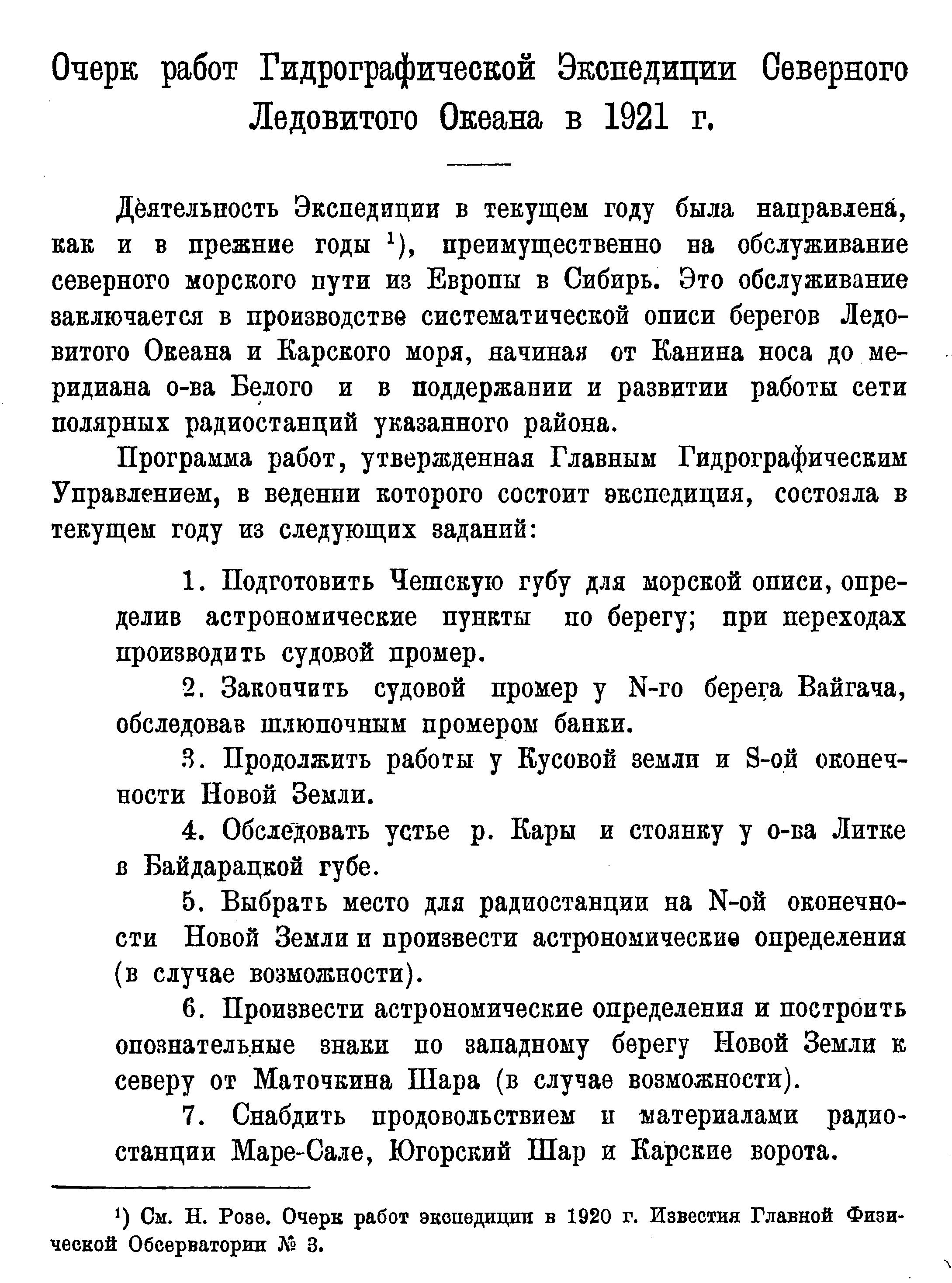 1), преимущественно на обслуживание северного морского пути из Европы в Сибирь. Это обслуживание заключается в производстве систематической описи берегов Ледовитого Океана и Карского моря, начиная от Канина носа до меридиана о-ва Белого и в поддержании и развитии работы сети полярных радиостанций указанного района.