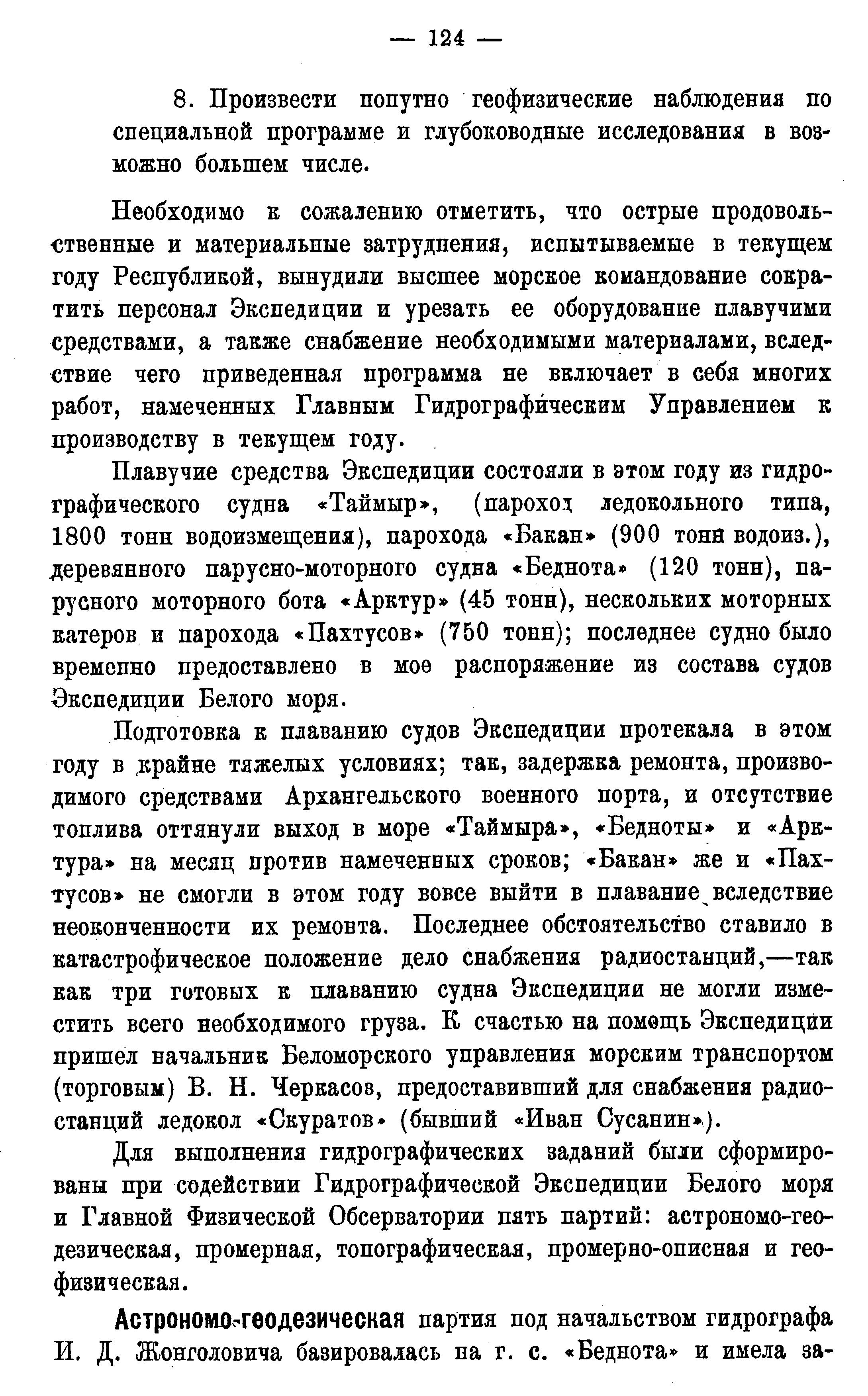 Необходимо к сожалению отметить, что острые продовольственные и материальные затруднения, испытываемые в текущем году Республикой, вынудили высшее морское командование сократить персонал Экспедиции и урезать ее оборудование плавучими средствами, а также снабжение необходимыми материалами, вследствие чего приведенная программа не включает в себя многих работ, намеченных Главным Гидрографическим Управлением к производству в текущем году.