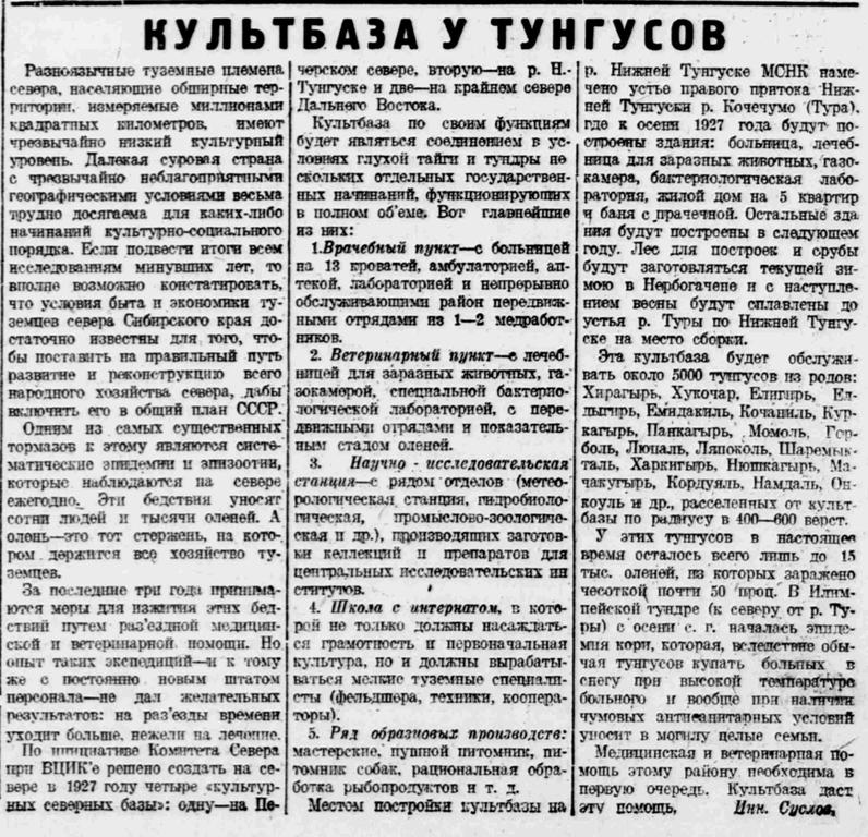 В беседе с нашим сотрудником тов. Суслов коснулся также своей летней работы на неисследованной ранее реке Чуне, впадающей в Подкаменную Тунгусску. Первичной целью этой экспедиции был сбор тунгусских сутланов (съездов). На эти съездах было выбрано 4 родовых совета и 4 родовых суда.