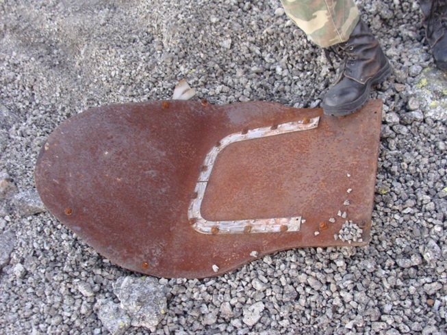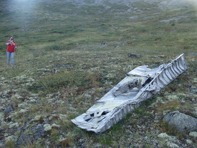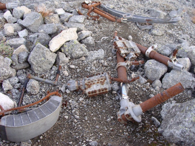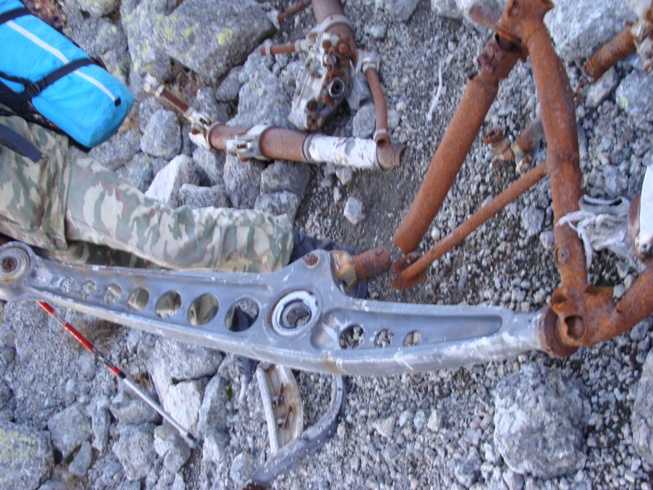 На вершине хребта лежат двигатели и стойки шасси, все остальное сбито лавинами в долину и превратилось в алюминиевый хлам.