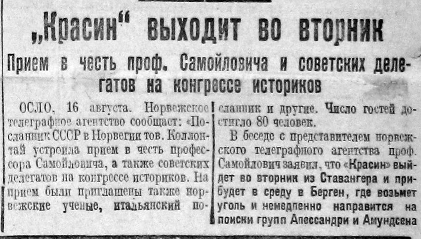 В беседе с представителем норвежского телеграфного агентства проф. Самойлович заявил, что "Красин" выйдет во вторник из Ставангера и прибудет в среду в Берген, где возьмет уголь и немедленно направится на поиски групп Алессандри и Амундсена.