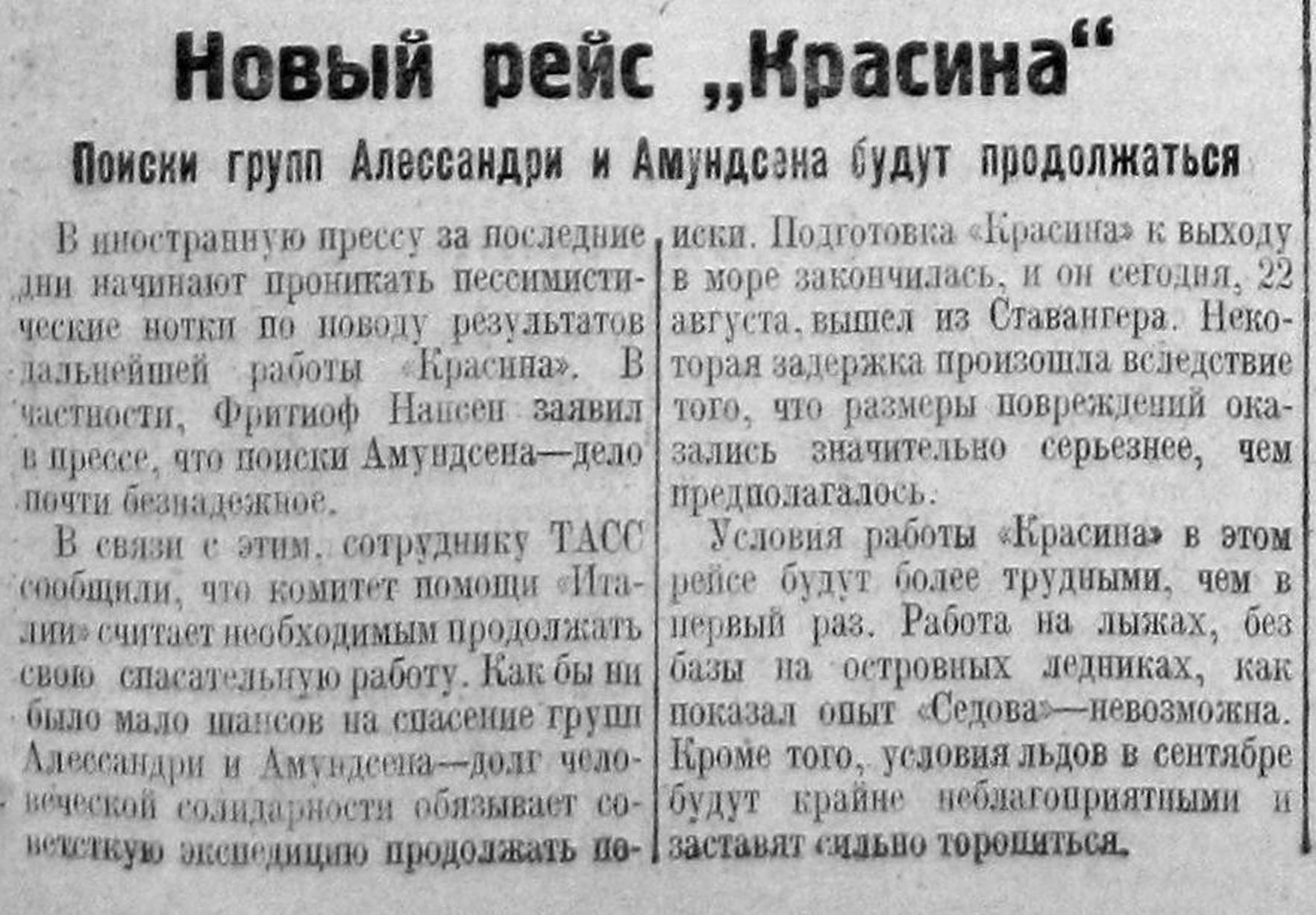 В иностранную прессу за последние дни начинают проникать пессимистические нотки по поводу результатов дальнейшей работы "Красина". В частности, Фритиоф Нансен заявил в прессе, что поиски Амундсена — дело почти безнадежное.