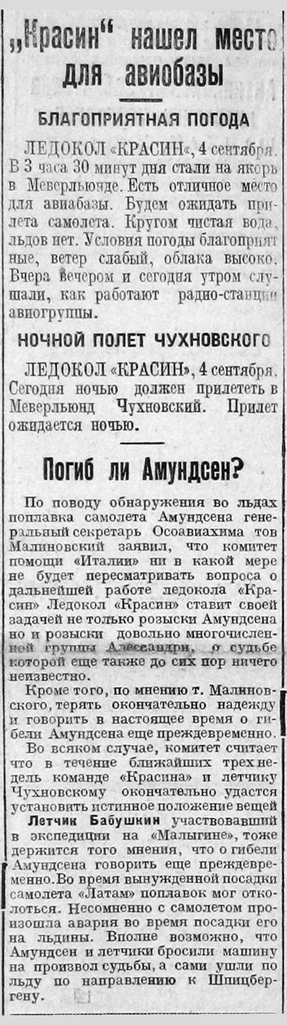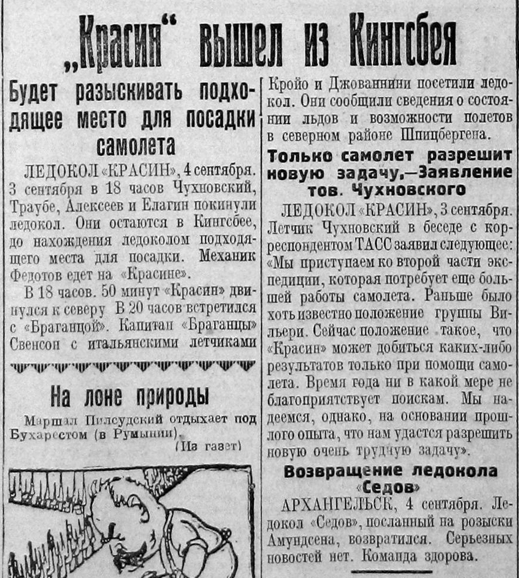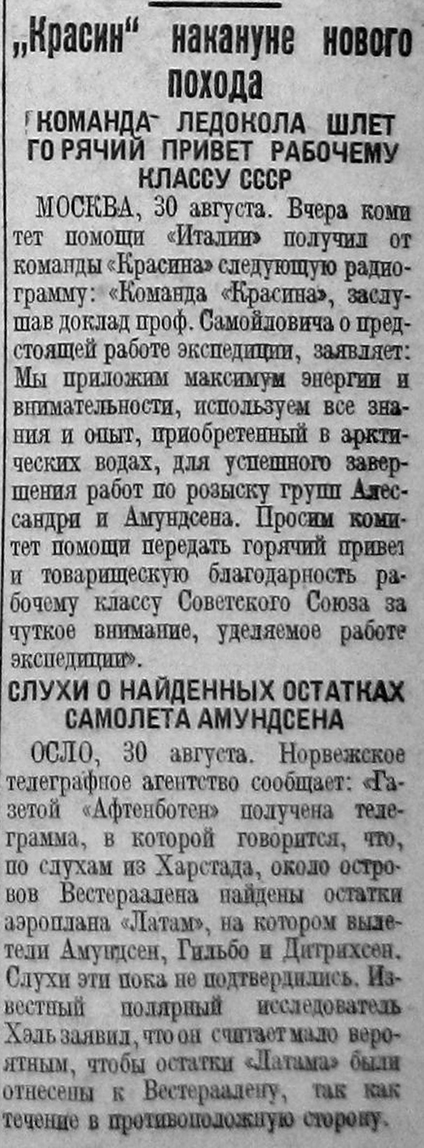 Вся команда здорова и в точно назначенный срок «Крясин» вышел морем в Кингсбей. Проф. Самойловичу дано указание продолжать плавание отнюдь не позже того времени, когда состояние льдов могло бы сделать невозможным возвращение «Красина» в этом году. Чухновский изменил поплавки на своем аппарате, так что состояние льдов, не дающих возможности подъёма на лыжах, не будет служить препятствием к полетам. На Чухновского выпадает сейчас особенно ответственная задача. «Красин» будет руководствоваться в выборе своего маршрута его указаниями. В норвежских общественных кругах убеждены в необходимости продолжать розыски Амундсена. Второй героический рейс нашего ледокола вызывает по отношению и нам живые симпатии».