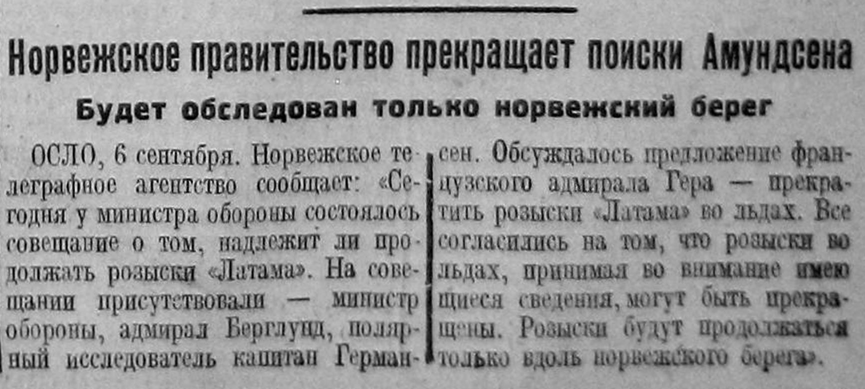 ОСЛО, 1 сентября. Норвежское телеграфное агентство сообщает из Тромсэ: «Сегодня в порт Тромсэ прибыло рыболовное судно, которое обнаружило во льдах поплавок, принадлежавший самолету, по всей вероятности, биплану «Латам», на котором находился Роальд Амундсен и французский летчик Гильбо. Привезенный рыболовным судном поплавок выкрашен в синий и серый цвета. Длина его — 2 метра и 32 сант.: наибольшая высота его — 58 сант. и наибольшая ширина — 56 сант. Поплавок перегородками разделен на 4 водонепроницаемых пространства. На нем имеются следы ремонта — заплата из медной пластинки, очевидно поставленная на нее до вылета из Норвегии. По мнению экспертов, состояние поплавка дает повод предполагать, что летчики пытались прикрепить его к самолету лучше, чем он был прикреплен первоначально. Это произошло, очевидно, после вылета из Тромсэ. О находке рыболовного судна послано телеграфное сообщение французскому крейсеру «Страсбург», который прибудет в Тромсэ сегодня ночью или завтра утром».