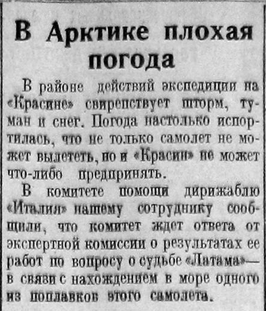 Уход итальянской экспедиции с самолетами затрудняет работу экспедиции «Красина». Тем не менее руководство экспедицией решило продолжать работу, пока позволит погода.