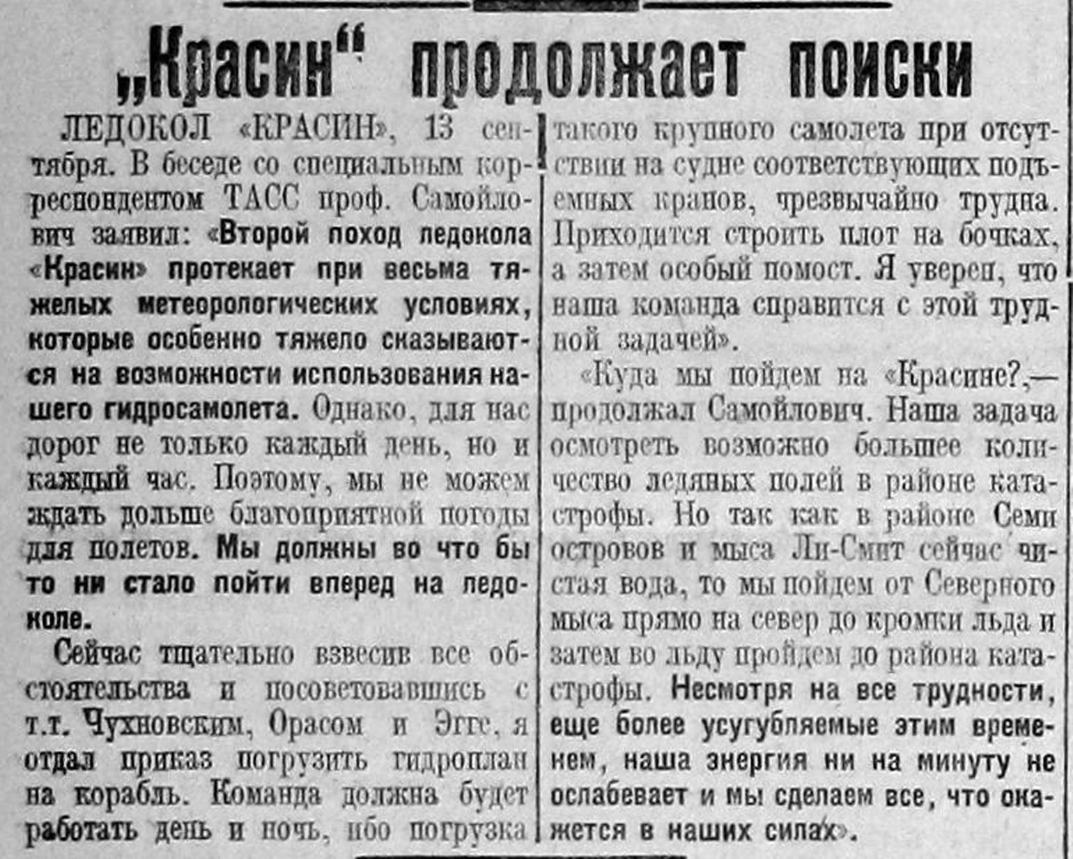 ЛЕДОКОЛ «КРАСИН», 13 сентября. В беседе со специальным корреспондентом ТАСС проф. Самойлович заявил: «Второй поход ледокола «Красин» протекает при весьма тяжелых метеорологических условиях, которые особенно тяжело сказываются на возможности использования нашего гидросамолета. Однако, для нас дорог не только каждый день, но и каждый час. Поэтому, мы не можем ждать дольше благоприятной погоды для полетов. Мы должны во что бы то ни стало пойти вперед на ледоколе.