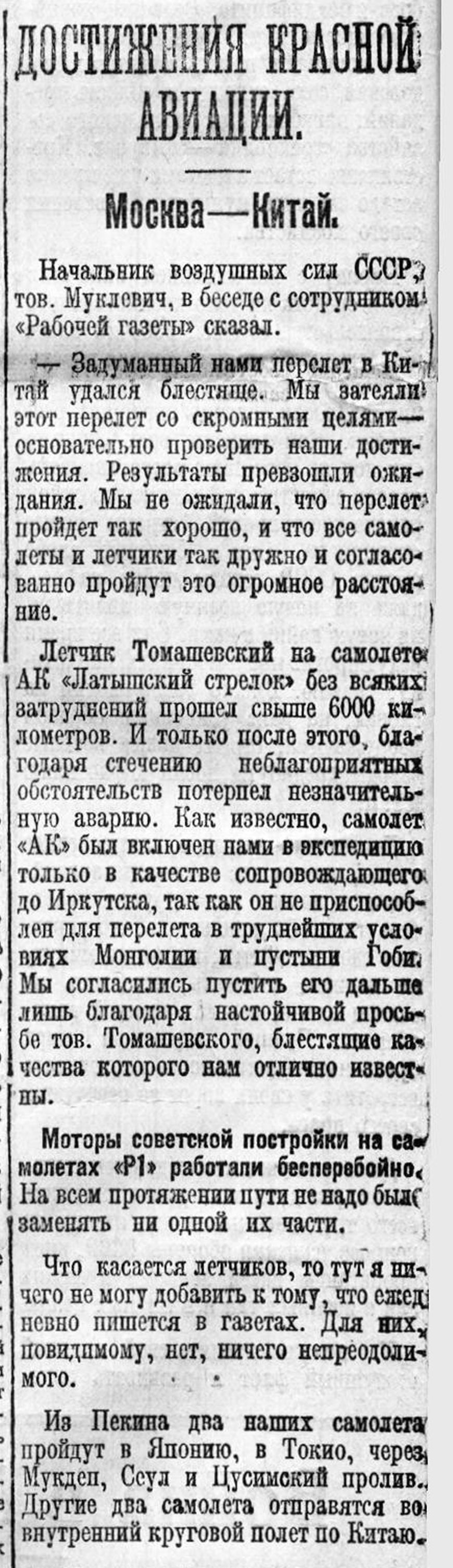 Летчик Томашевский на самолете АК «Латышский стрелок» без всяких затруднений прошел свыше 6000 километров. И только после этого, благодаря стечению неблагоприятных обстоятельств потерпел незначительную аварию. Как известно, самолет «АК» был включен нами в экспедицию только в качестве сопровождающего до Иркутска, так как он не приспособлен для перелета в труднейших условиях Монголии и пустыни Гоби Мы согласились пустить его дальше лишь благодаря настойчивой просьбе тов. Томашевского, блестящие качества которого нам отлично известны.
