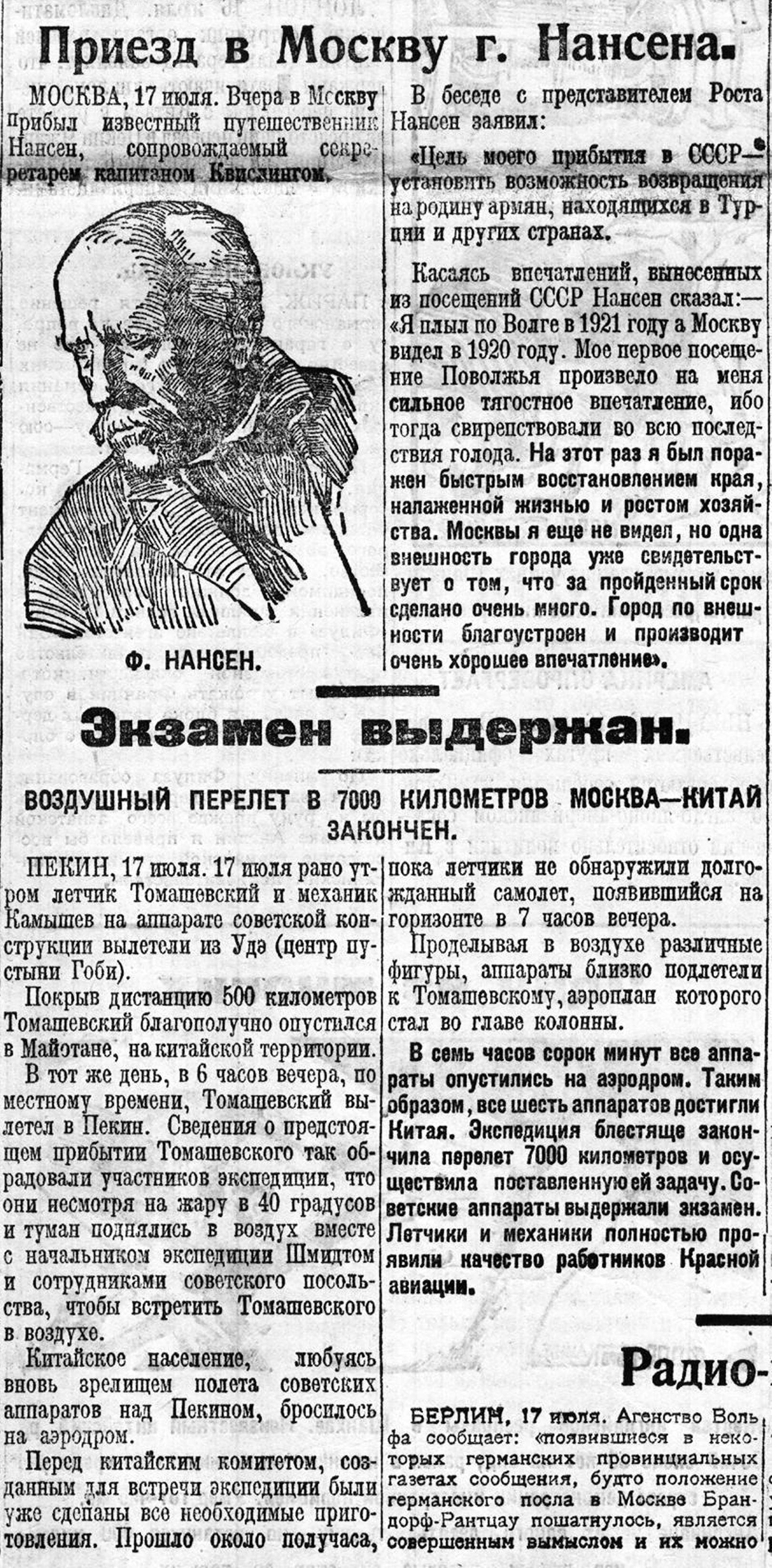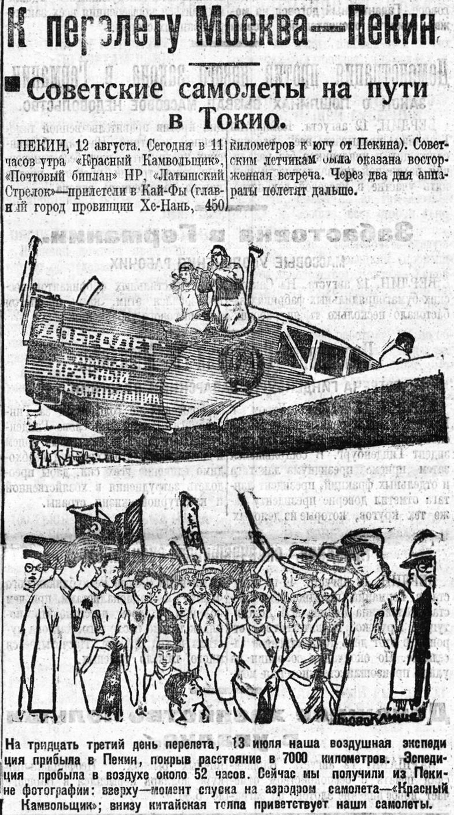 ПЕКИН, 13 июля. 13 июля в 12 час 45 минут по местному времени 3 аэроплана воздушной экспедиции благополучно снизились на пекинском аэродроме в следующем порядке: первым сел «Красный камвольщик» с пилотом Найденовым и механиком Орловым, затем «Р—1» с пилотом Громовым и механиком Радсевичем и наконец «Р—2» с пилотом Екатовым и механиком Мальковым. Четвертый аэроплан, пилотируемый Волковойновым задержался в Лайотань из-за скверной погоды. Там же временно задержался и начальник экспедиции тов. Шмидт.