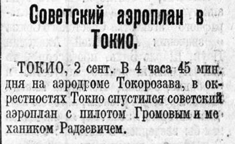 ПЕКИН, 29 августа. Сегодня в 6 часов утра, по пекинскому времени, два наших аэроплана Р1 и Р2 с летчиками Волковойновым и Громовым и механиками Родзевичем и Кузнецовым вылетели из Пекина в Токио через Мукден и Корею.