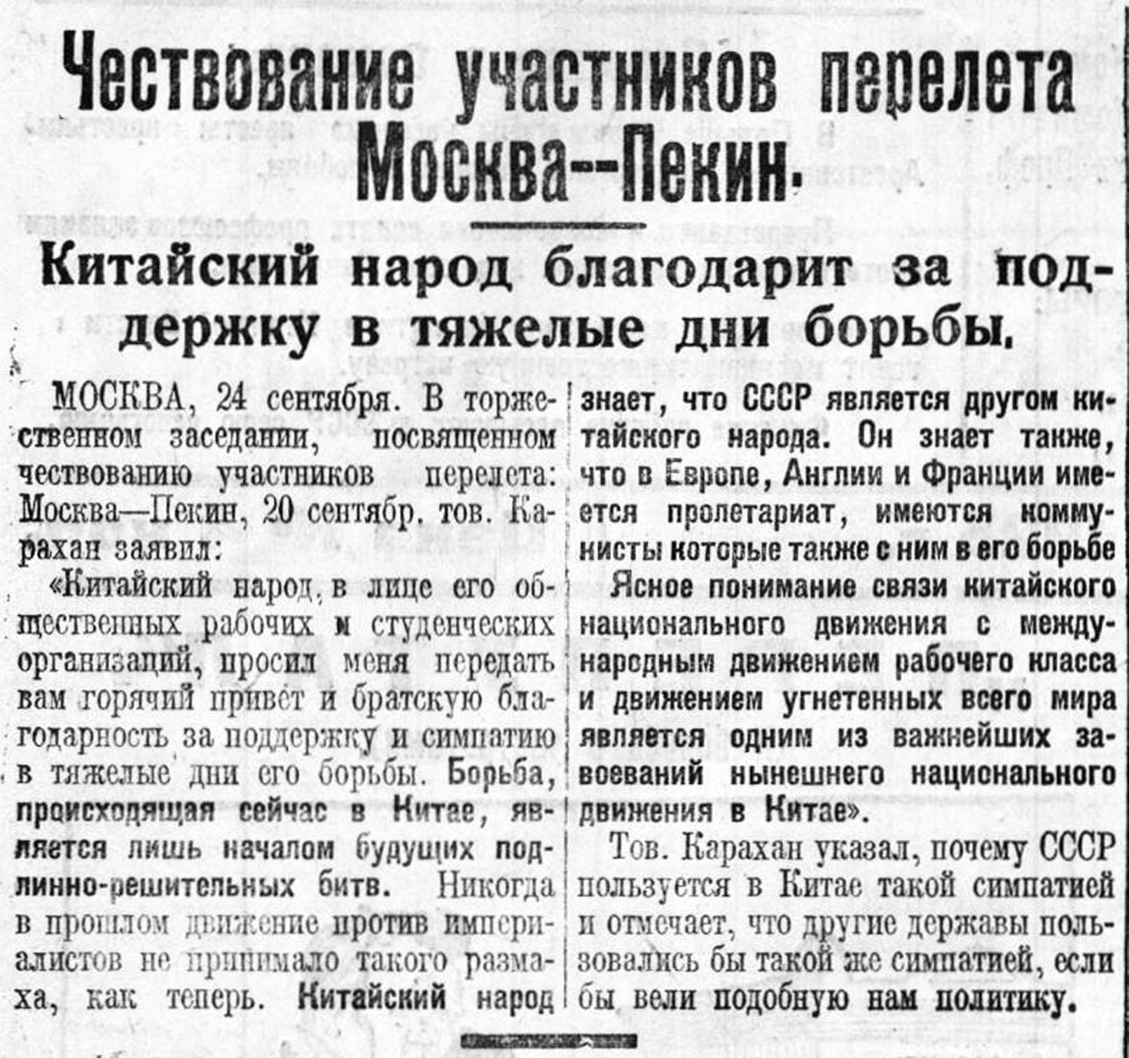 - Задуманный нами перелет в Китай удался блестяще. Мы затеяли этот перелет со скромными целями — основательно проверить наши достижения. Результаты превзошли ожидания. Мы не ожидали, что перелет пройдет так хорошо, и что все самолёты и летчики так дружно и согласованно пройдут это огромное расстояние.