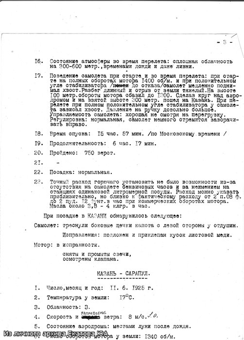 17. Поведение самолета при старте и во время перелета: при старте на полных оборотах мотора 1400 об/м. и при положительном угле стабилизатора /почти до отказа/самолет медленно поднимал хвост. Разбег длинный и отрыв от земли тяжелый. На высоте 100 метр. обороты мотора сбавил до 1300. Сделав круг над аэродромом и на взятой высоте 300 метр. пошел на Казань. При перелете при полном положительном угле стабилизатора у самолета зависал хвост. Давление на ручку довольно большое. Управляемость самолета: хорошая не смотря на перегрузку. Регулировка: нормальная, самолет немного стремится заворачивать вправо.