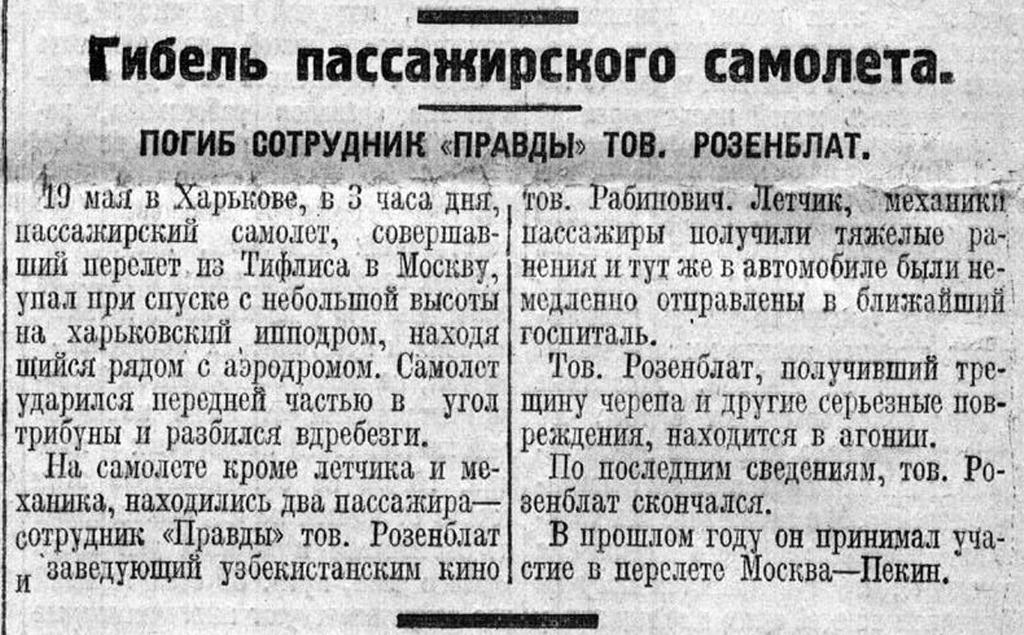 19 мая в Харькове, в 3 часа дня, пассажирский самолет, совершавший перелет из Тифлиса в Москву, упал при спуске с небольшой высоты на харьковский ипподром, находящийся рядом с аэродромом. Самолет ударился передней частью в угол трибуны и разбился вдребезги.