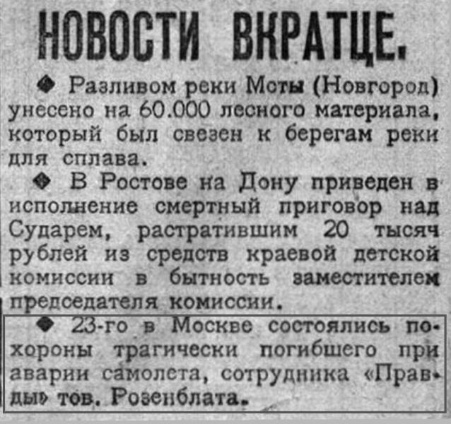 ♦ 23-го в Москве состоялись похороны трагически погибшего при аварии самолета, сотрудника "Правды" тов. Розенблата.