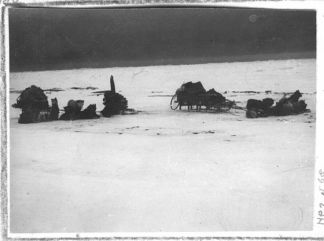 О-ВА СЕРГЕЯ КАМЕНЕВА. В течение всей зимы начальник станции Г. А. Ушаков деятельно готовился к большой экспедиции по исследованию Северной Земли. Сравнительно большая удаленность станции на о-вах Сергея Каменева от западного берега Северной Земли (60 км) вызвала необходимость устроить на берегу последней продовольственное депо, на котором будут базироваться ч дальнейшие работы. Это депо устроено на м. Серп и молот. В течение зимы Г. А. Ушаков совершил пять поездок на этот мыс, которые производились на двух усиленных собачьих упряжках, при средней нагрузке на каждую собаку в 30 кг. Первая поездка на Северную Землю была совершена еще осенью, вторая состоялась в начале декабря, а следующие были предприняты 28—30 января, 22—26 февраля и в начале марта. Сильные морозы до —47° и метели, а также темнота чрезвычайно затрудняли работу по устройству продовольственного депо на м. Серп и молот.