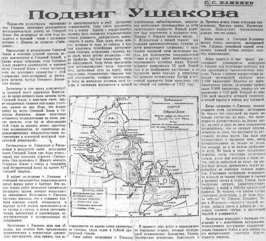 СТАНЦИЯ НА О-ВАХ СЕРГЕЯ КАМЕНЕВА (СЕВЕРНАЯ ЗЕМЛЯ). Начальник станции Г. А. Ушаков сообщает о нормальном ходе жизни и работы. В декабре, при свете луны, была совершена большая подготовительная экскурсия на собаках на Северную Землю для устройства складов. Связь со станцией довольно неустойчива. Был перерыв в работе ее по причине обрыва антенны во время урагана. Силами личного состава закончена постройка магнитного домика, начаты наблюдения в нем. Производятся определения астрономического пункта. Весной Г. А. Ушаков и геолог Н. Н. Урванцев предполагают совершить большую санную экспедицию для исследования берегов Северной Земли.