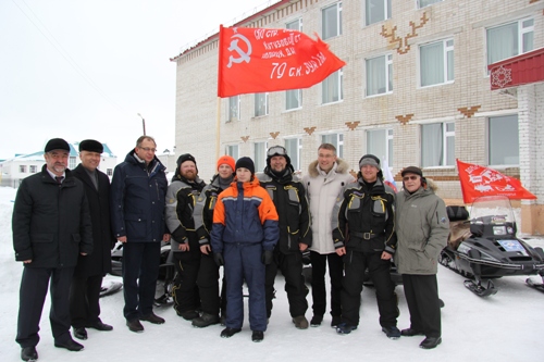 После митинга и официальных речей, четыре боевых машины, очищенные священным дымом ненецкого обряда, под «Марш славянки» пересекли улицу Первомайскую и спустились на замёрзшую Печору. Практически никем не замеченный, под шумок и дымок, за ними отправился ещё один снегоход. В команде «вольнонаёмных» – депутат Архангельского областного Собрания от НАО Матвей Чупров, в качестве информационного сопровождения – корреспондент ВНАО. В походном порядке пять снегоходов двинулись к первой точке маршрута – селу Тельвиска, через которую в годы войны проходил путь оленетранспортных эшелонов.