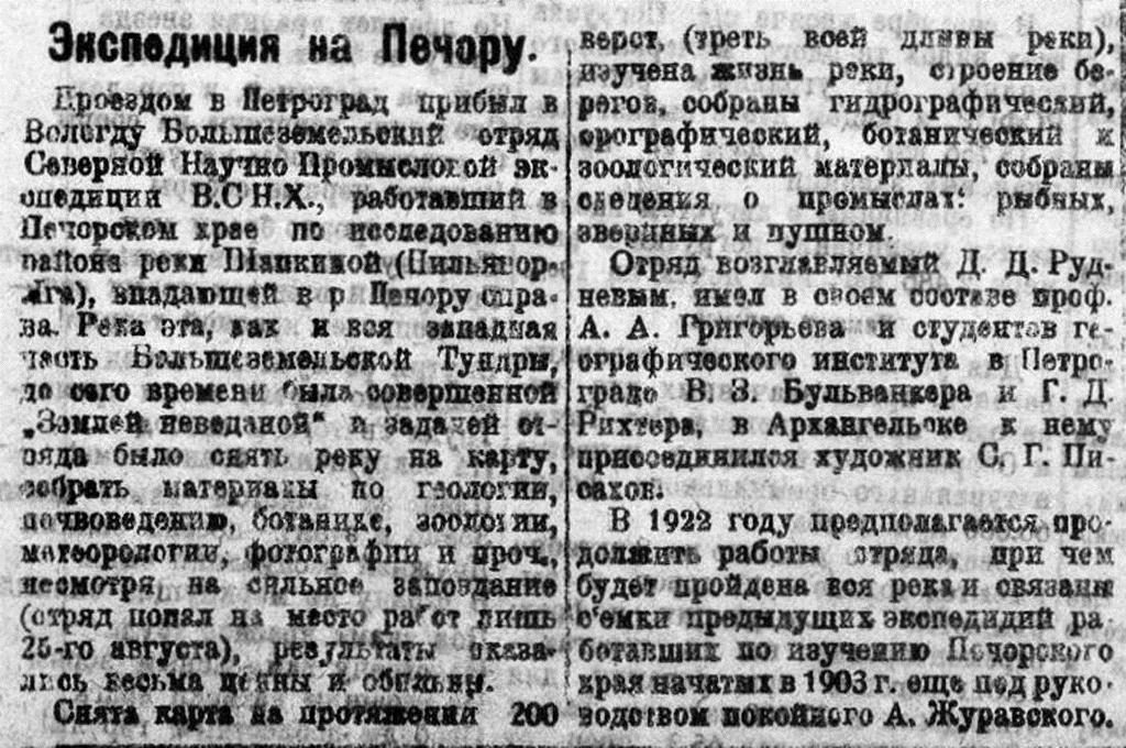 Проездом в Петроград прибыл в Вологду Большеземельский отряд Северной Научно Промысловой экспедиции В. С. Н. Х., работавший в Печорском крае по исследованию района реки Шапкиной (Пильворъяга), впадающей в р. Печору справа. Река эта, как и вся западная часть Большеземельский Тундры, до сего времени была совершенной "Землей наведанной" и задачей отряда было снять реку на карту, собрать материалы по геологии, почвоведению, ботанике, зоологии, метеорологии, фотографии и проч., несмотря, на сильное запоздание (отряд попал на место работ лишь 25-го августа), результаты оказались весьма ценны и обильны.