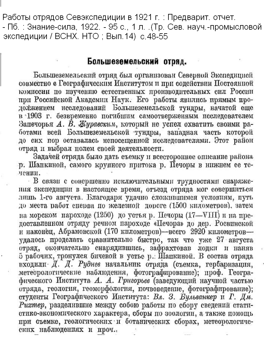 Список экспедиций СНПЭ — ИИС — ВАИ в период 1920 — 1935 гг.1921 г. Большеземельская экспедиция совместно с Географическим институтом проводила топографические и геологические работы в районе р. Шапкиной под начальством Д. Д. Руднева