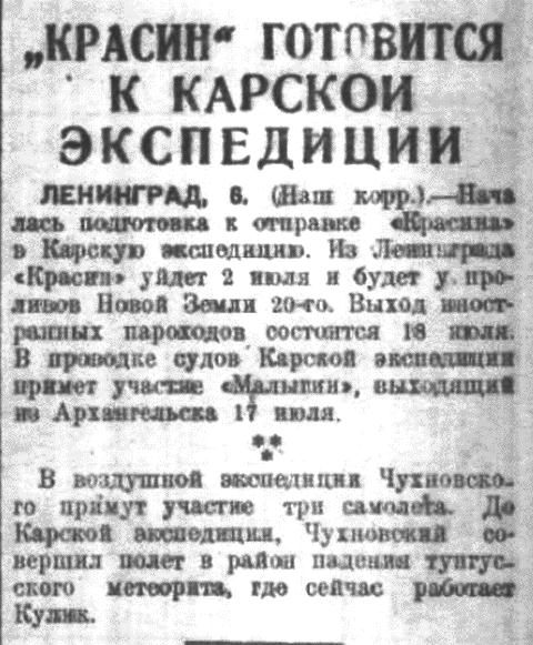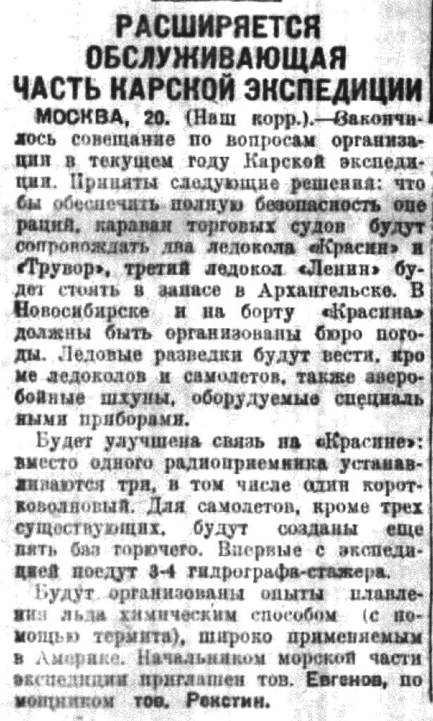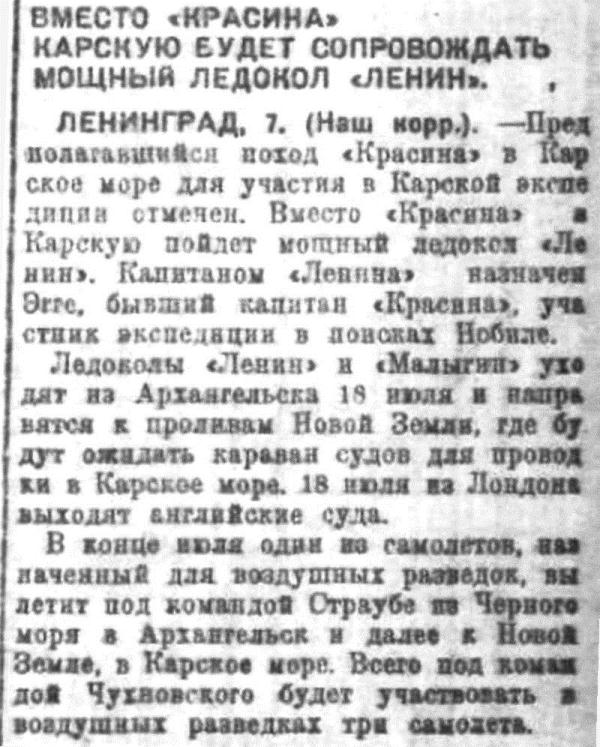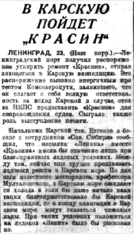 Начальник Карской тов. Евгенов в беседе с сотрудником «Сов. Сибири сообщил, что посылка «Ленина» вместо «Красина» имела бы значение лишь при благоприятных ледовых условиях. Между тем, сейчас еще трудно предсказать ледовый режим в Карском море. По данным известного метеоролога профессора Мултановского, в Карском море ожидаются холода и если бы даже начало навигации благоприятствовало бы Карской экспедиции, то к концу навигации в Карском море могут оказаться тяжелые льды. При таких условиях положиться на ледокол «Ленин» было бы рискованно.
