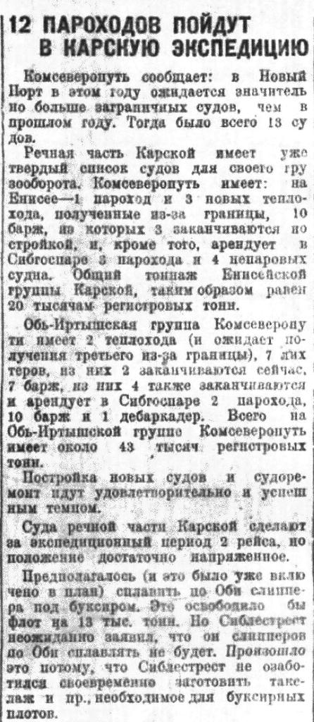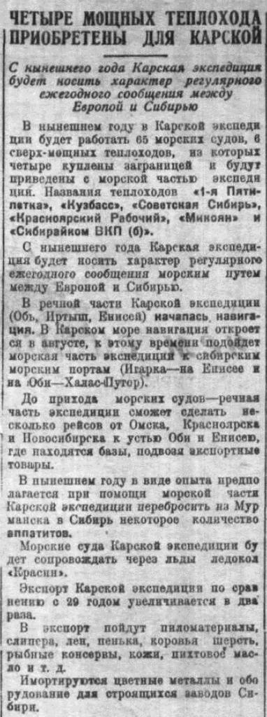 В нынешним году в Карской экспедиции будет работать 65 морских судов, 6 сверхмощных теплоходов, из которых четыре куплены заграницей и будут приведены с морской частью экспедиции. Названия теплоходов «1-я Пятилетка», «Кузбасс», «Советская Сибирь», «Красноярский Рабочий», «Микоян» и «Сибкрайком ВКП (б)».