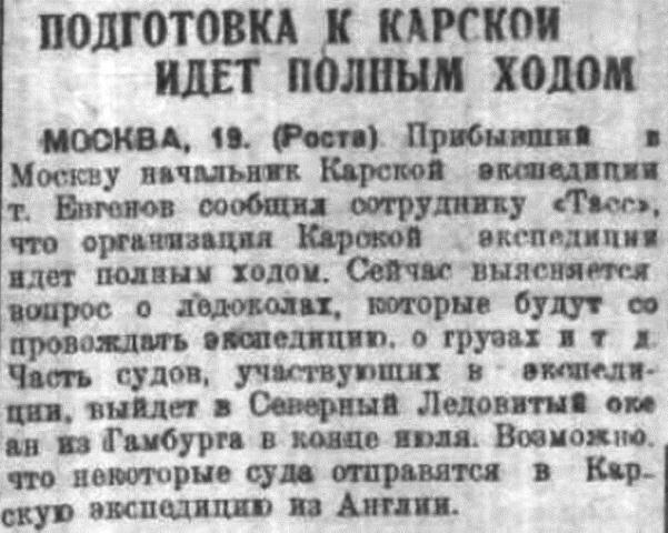 МОСКВА. 11. (Роста) Прибывший в Москву начальник Карской экспедиции т. Евгенов сообщил сотруднику «Тасс», что организация Карской экспедиции идет полным ходом. Сейчас выясняется вопрос о ледоколах, которые будут сопровождать экспедицию, о грузах и т. д. Часть судов, участвующих в экспедиции, выйдет в Северный Ледовитый океан из Гамбурга в конце июля. Возможно, что некоторые суда отправятся в Карскую экспедицию из Англии.