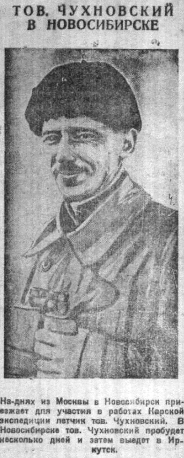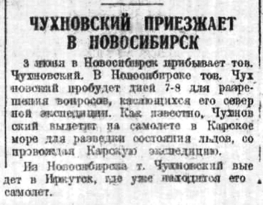 3 июня в Новосибирск прибывает тов. Чухновский. В Новосибирске тов. Чухновский пробудет дней 7-8 для разрешения вопросов, касающихся его северной экспедиции. Как известно, Чухновский вылетит на самолете в Карское море для разведки состояния льдов, сопровождая Карскую экспедицию.