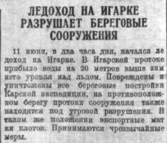 11 июня, в два часа дня, начался ледоход на Игарке. В Игарской протоке прибыло воды на 20 метров выше зимнего уровня над льдом. Повреждены и уничтожены все береговые постройки Карской экспедиции, на противоположном берегу протоки сооружения также находится под угрозой разрушения. В таком же положении экспортные матки плотов. Принимаются чрезвычайные меры.