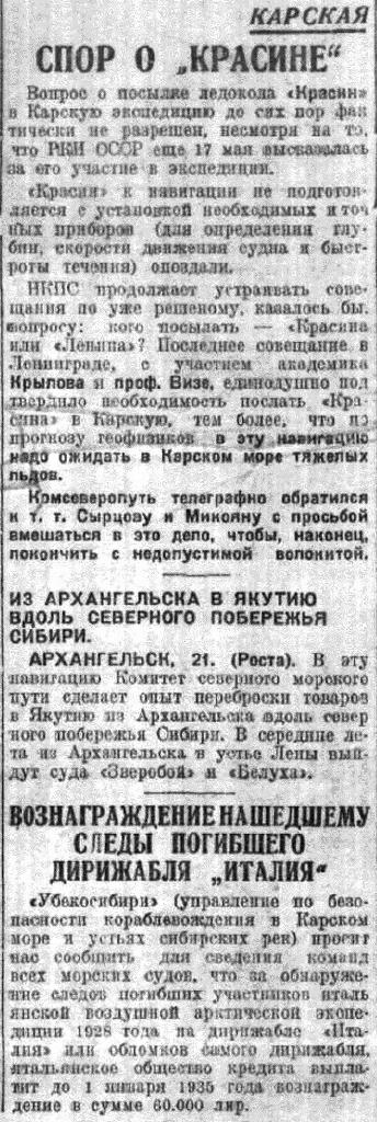 «Убекосибири» (управление по безопасности кораблевождения в Карском море и устьях сибирских рек) просит нас сообщить для сведения команд всех морских судов, что за обнаружение следов погибших участников итальянской воздушной арктической экспедиции 1928 года на дирижабле «Италия» или обломков самого дирижабля, итальянское общество кредита выплатит до 1 января 1935 года вознаграждение в сумме 60. 000 лир.