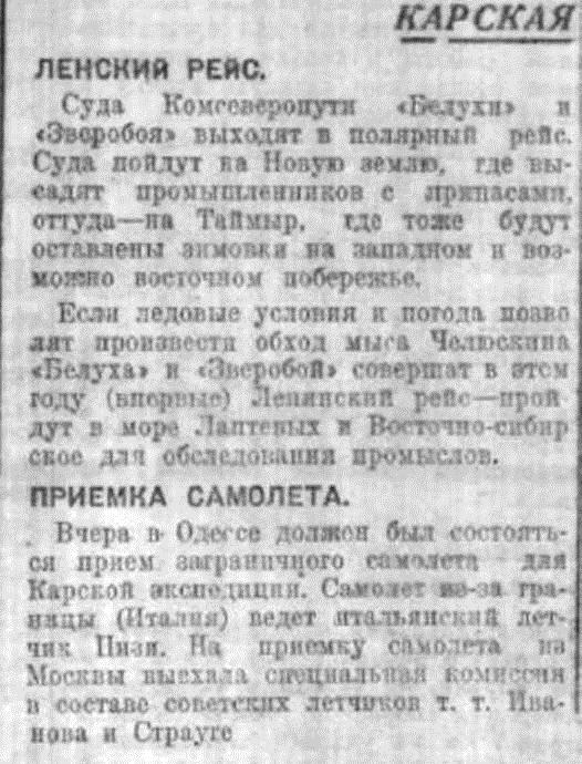 Вчера в Одессе должен был состояться прием заграничного самолета для Карской экспедиции. Самолет из-за границы (Италия) ведет итальянский летчик Пизи. На приемку самолета из Москвы выехала специальная комиссия в составе советских летчиков т. т. Иванова и Страубе.