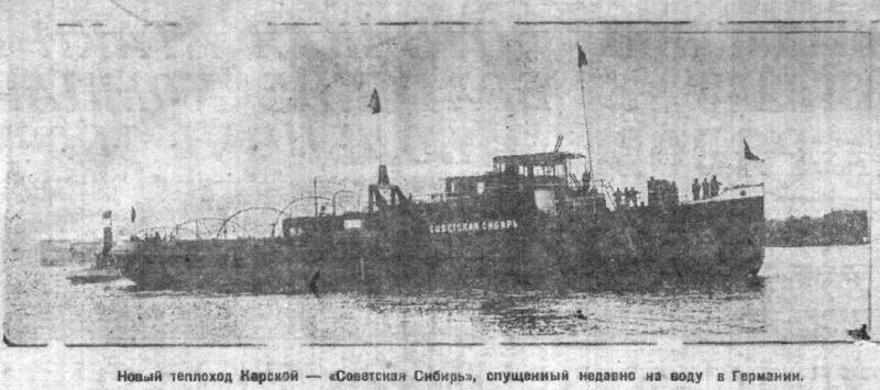 ОМСК. 7. (Наш корр.). — В Данциг выехала группа сотрудников Комсеверопути для приема строящегося на данцигских верфях теплохода Карской экспедиции «Советская Сибирь». В том же году закончится постройка второго теплохода для Карской «Первая Пятилетка». Оба теплохода - типа «Микоян». В Сибирь теплоходы придут в составе Карской экспедиции, при чем «Советская Сибирь» будет работать в Обь-Иртышской части Карской, а «Первая Пятилетка» на Енисее.