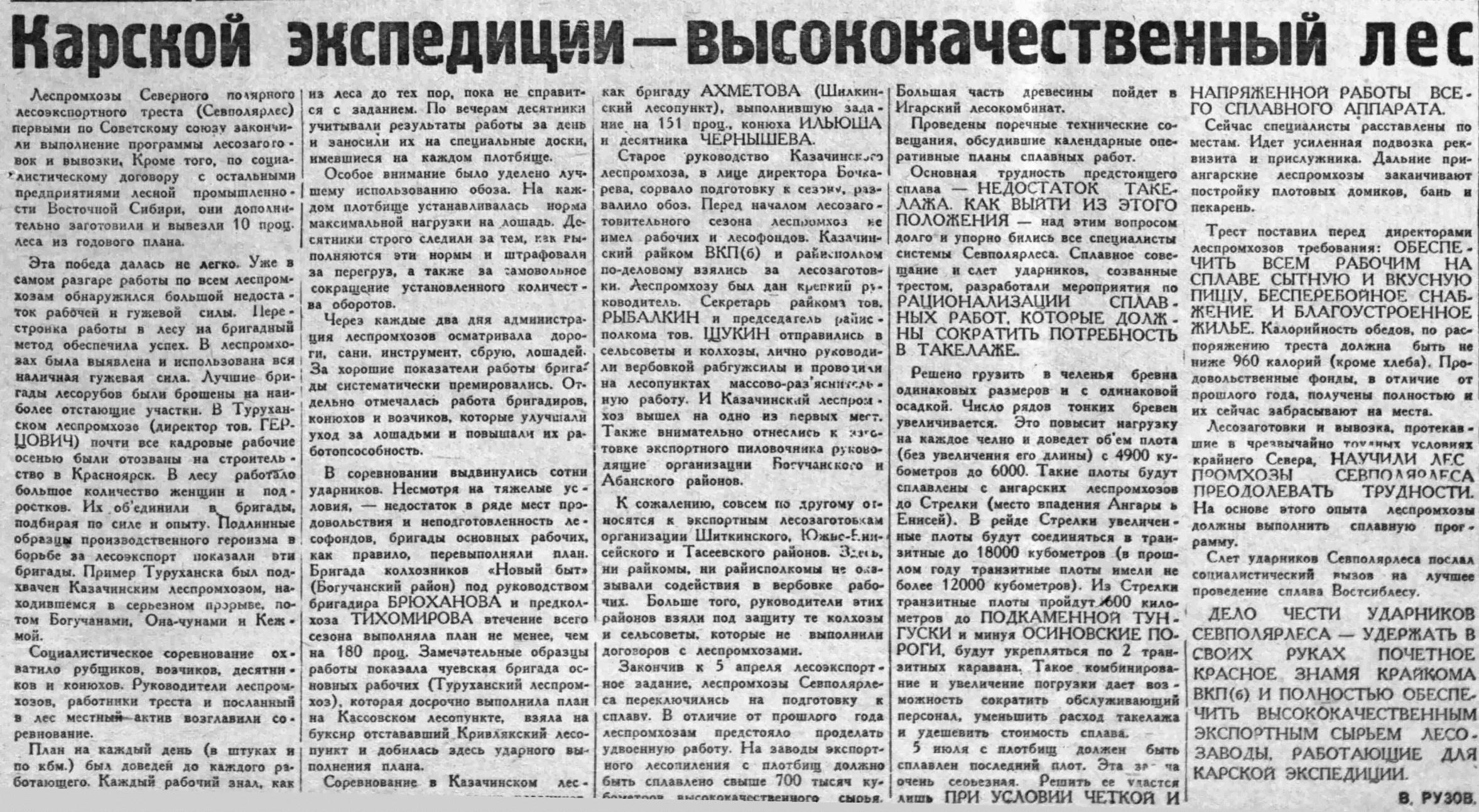 Завтра ожидается прибытие в порт второго звена Карской. Игарку охватила тревога. Нет подкрепления рабочей силой. Непрестанные штормы задерживают прибытие караванов с завербованными рабочими. Навстречу им отправляются катера. Но напряженность с рабочей силой не смущает игарцев. На помощь лесокомбинату идут рабочие других предприятий. Проведенные в учреждениях митинги показали высокую сознательность трудящихся города. На призыв местных организаций они ответили решением отработать в течение пятидневки 1000 человекодней. Сегодня состоялся первый субботник, в нем участвовало 260 человек. Календарные срока погрузки выдерживаются.