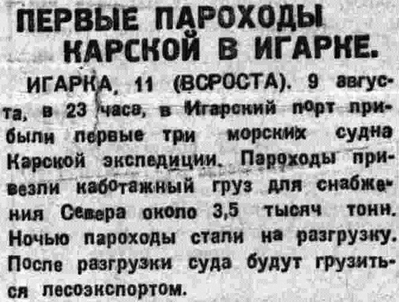 ИГАРКА, 13. Пришли морские суда Карской, и центр города сразу переместился на прекрасно оборудованную причальную линию. К ровной, как натянутая струна, линии протяжением в 640 метров могут одновременно пришвартоваться 7 морских пароходов. Пока здесь стоят только 4 парохода, преимущественно под английским флагом.
