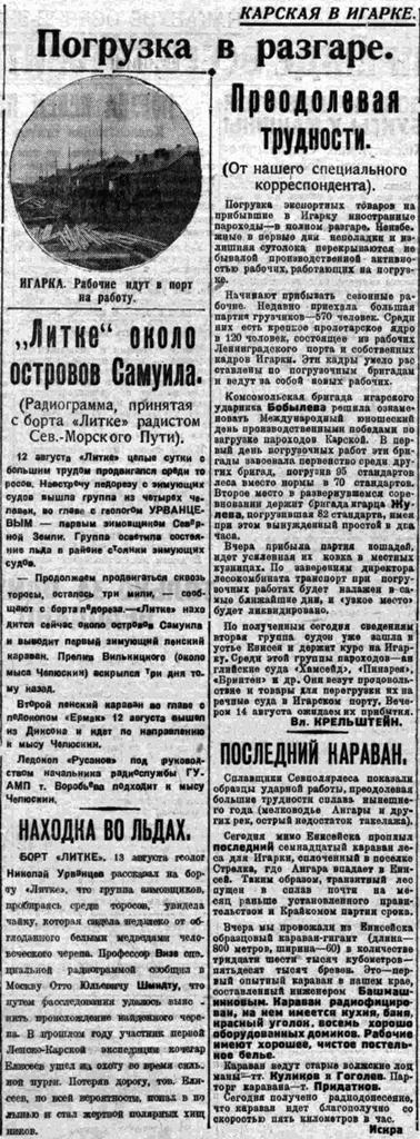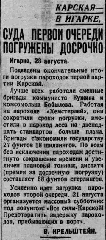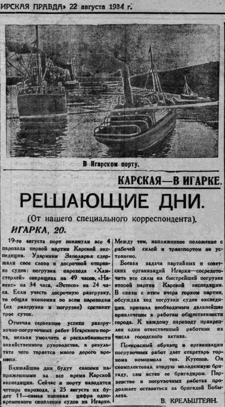 ВСП 1934 № 187, 15 августа.КАРСКАЯ — В ИГАРКЕПОРТ РАБОТАЕТ КРУГЛЫЕ СУТКИ.(По радио от нашего специального корреспондента).