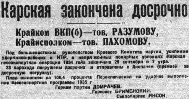 Закончились круглосуточные полярные дни. На смену естественному свету пришло электричество. Лампочки Ильича заливают яркими огнями линию биржи. Порт живет круглые сутки. Шум лебедок, жужжание лесовозных моторов и доподлинно ударная работа в трюмах создают незабываемое впечатление. Отважные ударники Заполярья встречают Карскую под лозунгом максимального сохранения валюты. В производственный поход включаются бригада за бригадой. Два дня погрузочных операций прекрасно подтверждают глубокое понимание игарцами своего долга перед страной. Они помнят обещание, данное тов. Разумову.