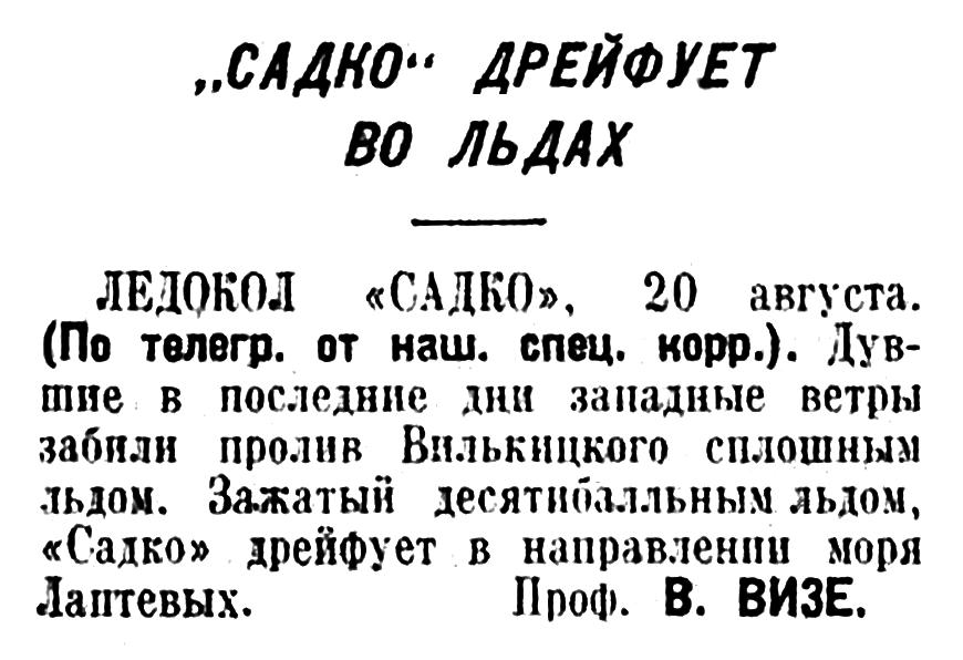 28 августа в адрес „Садко" получена телеграмма из Главсевморпути:
