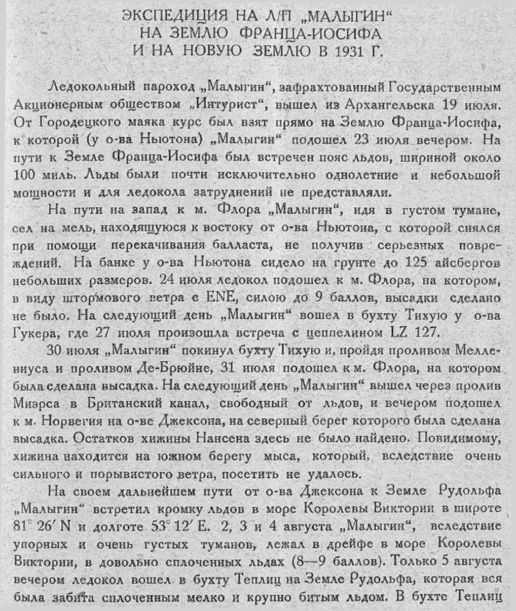 ЭКСПЕДИЦИЯ НА Л/П „МАЛЫГИН" НА ЗЕМЛЮ ФРАНЦА-ИОСИФА И НА НОВУЮ ЗЕМЛЮ В 1931 Г.