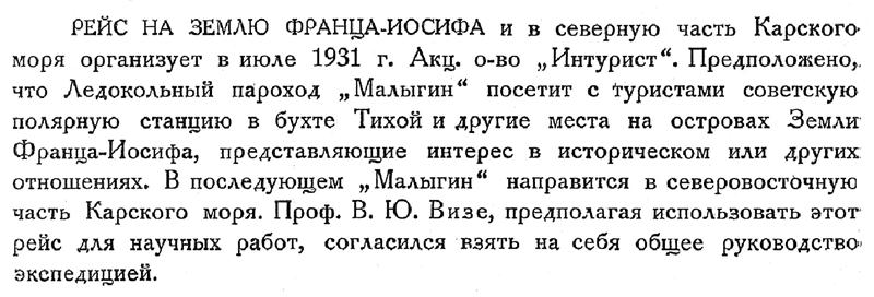 РЕЙС НА ЗЕМЛЮ ФРАНЦА-ИОСИФА и в северную часть Карского моря организует в июле 1931 г. Акц. о-во „Интурист". Предположено, что Ледокольный пароход „Малыгин" посетит с туристами советскую полярную станцию в бухте Тихой и другие места на островах Земли Франца-Иосифа, представляющие интерес в историческом или других отношениях. В последующем „Малыгин" направится в северовосточную часть Карского моря. Проф. В. Ю. Визе, предполагая использовать этот рейс для научных работ, согласился взять на себя общее руководство-экспедицией.