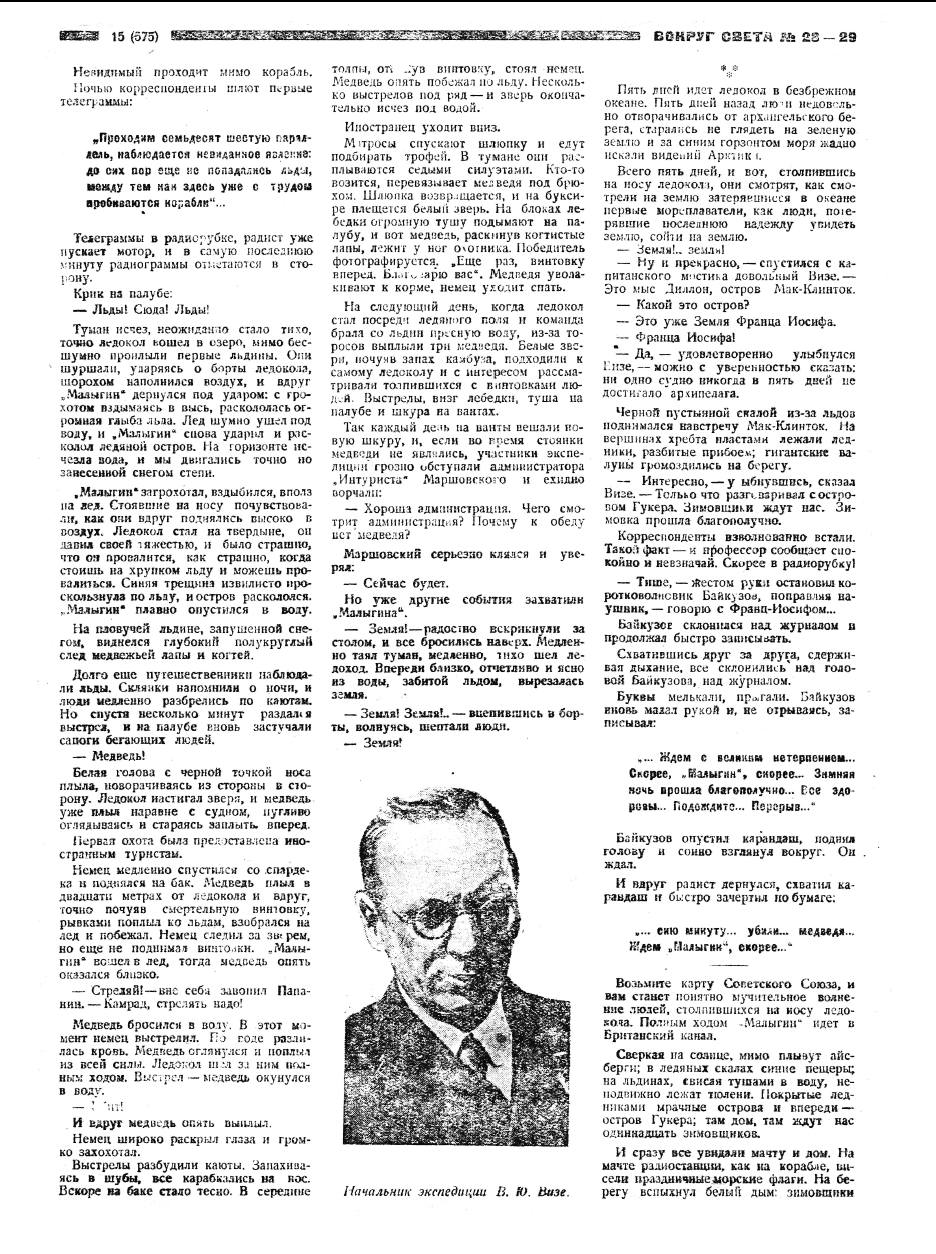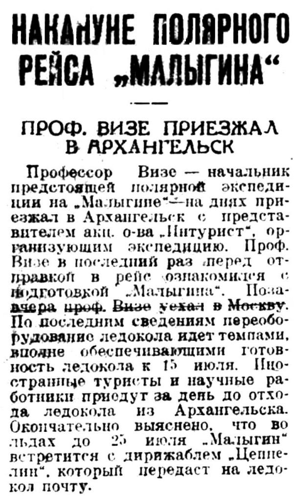 Профессор Визе — начальник предстоящей полярной экспедиции на "Малыгине” — на днях приезжал в Архангельск с представителем акц. о-ва "Интурист", организующим экспедицию. Проф. Визе в последний раз перед отправкой в рейс ознакомился с подготовкой "Малыгина". Позавчера проф. Визе уехал в Москву. По последним сведениям переоборудование ледокола идет темпами, вполне обеспечивающими готовность ледокола к 15 июля. Иностранные туристы и научные работники приедут за день до отхода ледокола из Архангельска. Окончательно выяснено, что во льдах до 25 июля "Малыгин" встретится с дирижаблем "Цеппелин", который передаст на ледокол почту.