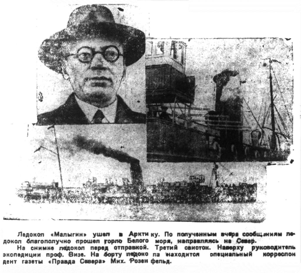 На снимке ледокол перед отправкой. Третий свисток. Наверху руководитель экспедиции проф. Визе. На борту ледокола находится специальный корреспондент газеты «Правда Севера» Мих. Розенфельд.