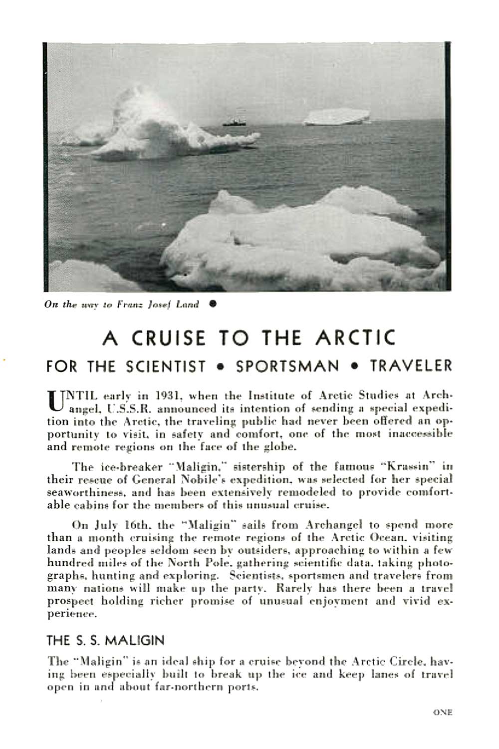 Ледокольный пароход „Малыгин", зафрахтованный Государственным Акционерным обществом „Интурист", вышел из Архангельска 19 июля. От Городецкого маяка курс был взят прямо на Землю Франца-Иосифа, к которой (у о-ва Ньютона) „Малыгин" подошел 23 июля вечером. На пути к Земле Франца-Иосифа был встречен пояс льдов, шириной около 100 миль. Льды были почти исключительно однолетние и небольшой мощности и для ледокола затруднений не представляли.