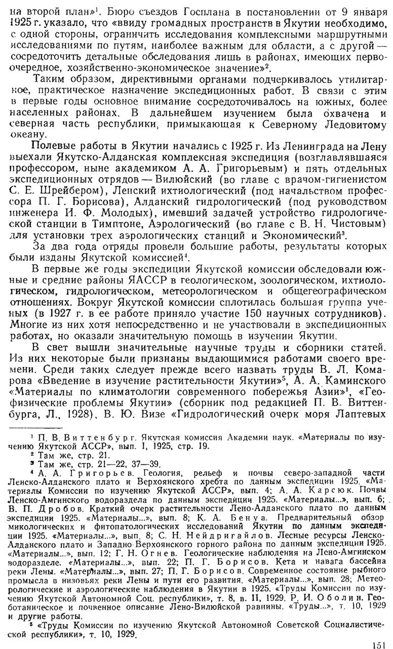 {4} А. А. Григорьев. Геология, рельеф и почвы северо-западной части Ленско-Алданского плато и Верхоянского хребта по данным экспедиции 1925. «Материалы Комиссии по изучению Якутской АССР», вып. 4; А. А. Карсюк. Почвы Ленско-Амгинского водораздела по данным экспедиции 1925. «Материалы... », вып. 6; В. П. Дробов. Краткий очерк растительности Лено-Алданского плато по данным экспедиции 1925. «Материалы... », вып. 8; К. А. Бенуа. Предварительный обзор микологических и фитопатологических исследований Якутии по данным экспедиции 1925. «Материалы... », вып. 8; С. Н. Нейдригайлов. Лесные ресурсы Ленско-Алданского плато и Западно-Верхоянского горного района по данным экспедиции 1925. «Материалы... », вып. 12; Г. Н. Огнев. Геологические наблюдения на Лено-Амгинском водоразделе. «Материалы... », вып. 22; П. Г. Борисов. Кета и навага бассейна реки Лены. «Материалы... », вып. 27; П. Г. Борисов. Современное состояние рыбного промысла в низовьях реки Лены и пути его развития. «Материалы... », вып. 28; Метеорологические и аэрологические наблюдения в Якутии в 1925. «Труды Комиссии по изучению Якутской Автономной Соц. республики», т. 8, в. II, 1929. Р. И. Оболин. Геоботаническое и почвенное описание Лено-Вилюйской равнины. «Труды... », т. 10, 1929 и другие работы.