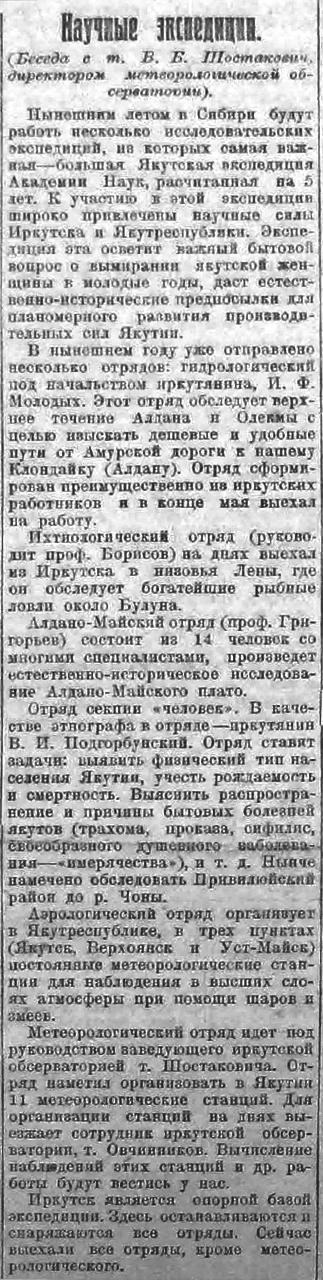 Нынешним летом в Сибири будут работать несколько исследовательских экспедиций, из которых самая важная — большая Якутская экспедиция Академии Наук, рассчитанная на 5 лет. К участию в этой экспедиции широко привлечены научные силы Иркутска и Якутреспублики. Экспедиция эта осветит важный бытовой вопрос о вымирании якутской женщины в молодые годы, даст естественно-исторические предпосылки для планомерного развития производительных сил Якутии.