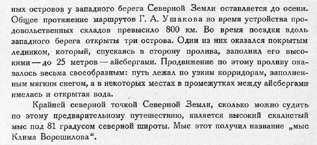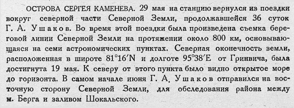 По донесению начальника Научно-исследовательской станции, организованной в 1930 г. Арктическим институтом на о-вах Каменева, Г. А. Ушакова, им, совместно с Н. Н. Урванцевым, были совершены в течение минувшей весны две продолжительные санные экспедиции, в результате которых уже выяснено в основных чертах строение группы больших и малых островов, известных под названием Северной Земли. Ядро группы составляют три больших острова, названных исследователями: центральный — о-вом Октябрьской революции, южный — о-вом Большевик и северный — о-вом Комсомолец. За проливом между центральным и южным островами оставлено наименование пролива Шокальского, северный же назван проливом Красной армии.