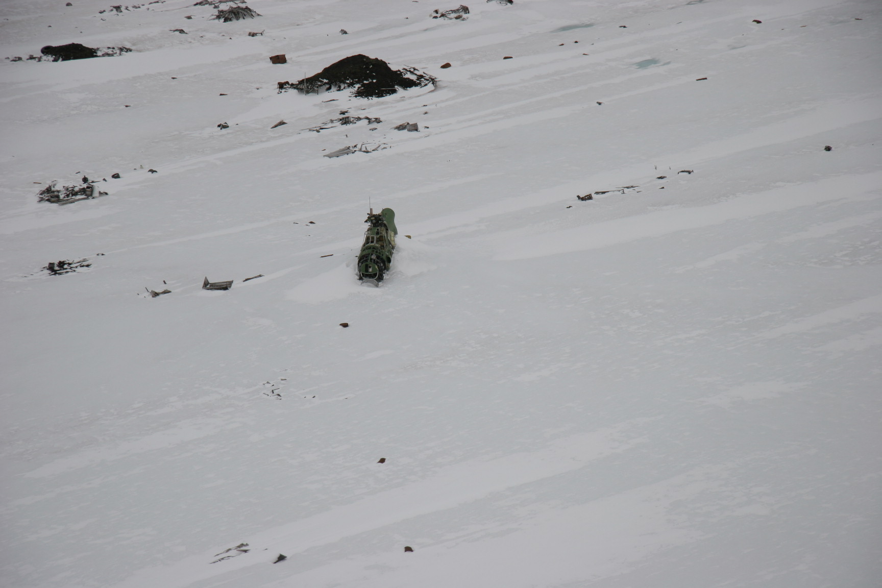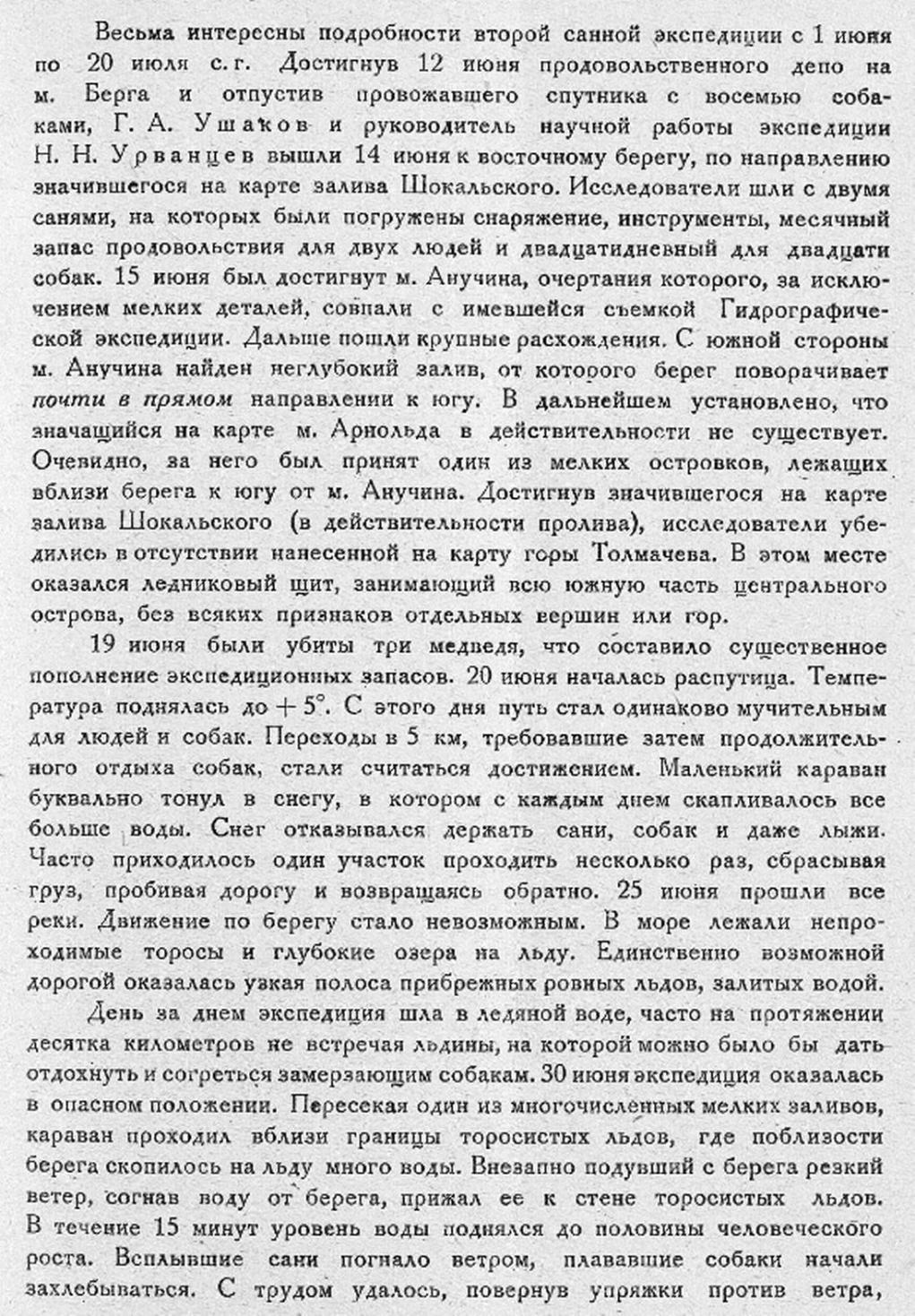 Весьма интересны подробности второй санной экспедиции с 1 июня по 20 июли с. г. Достигнув 12 июня продовольственного депо на м. Берга и отпустив провожавшего спутника с восемью собаками, Г. А. Ушаков и руководитель научной работы экспедиции Н. Н. Урванцев вышли 14 июня к восточному берегу, по направлению значившегося на карте залива Шокальского. Исследователи шли с двумя санями, на которых были погружены снаряжение, инструменты, месячный запас продовольствия для двух людей и двадцатидневный для двадцати собак. 15 июня был достигнут м. Анучина, очертания которого, за исключением мелких деталей, совпали с имевшейся съемкой Гидрографической экспедиции. Дальше пошли крупные расхождения. С южной стороны м. Анучина найден неглубокий залив, от которого берег поворачивает почти в прямом направлении к югу. В дальнейшем установлено, что значащийся на карте м. Арнольда в действительности не существует. Очевидно, за него был принят один из мелких островков, лежащих вблизи берега к югу от м. Анучина. Достигнув значившегося на карте залива Шокальского (в действительности пролива), исследователи убедились в отсутствии нанесенной на карту горы Толмачева. В этом месте оказался ледниковый щит, занимающий всю южную часть центрального острова, без всяких признаков отдельных вершин или гор.