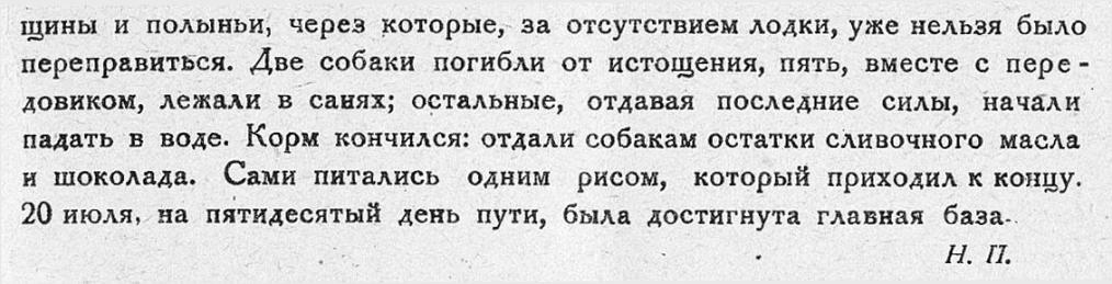 18 июля на п-ове Парижской коммуны был сомкнут маршрут с последней точкой, нанесенной на карту раньше. На льду появились трещины и полыньи, через которые, за отсутствием лодки, уже нельзя было переправиться. Две собаки погибли от истощения, пять, вместе с передовиком, лежали в санях; остальные, отдавая последние силы, начали падать в воде. Корм кончился: отдали собакам остатки сливочного масла и шоколада. Сами питались одним рисом, который приходил к концу. 20 июля, на пятидесятый день пути, была достигнута главная база.