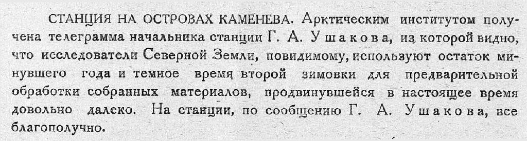 Из донесений Г. А. Ушакова видно, что исследование Северной Земли потребовало значительного напряжения сил и лишений. Общее протяжение всех маршрутов на собаках за зиму 1930/31 г. и за весну этого года превышает 3000 км, из которых 1500 км падает на маршрутную съемку, охватившую площадь около 25 000 км. Съемка базируется на 13 астрорадиопунктов и магнитных определений.