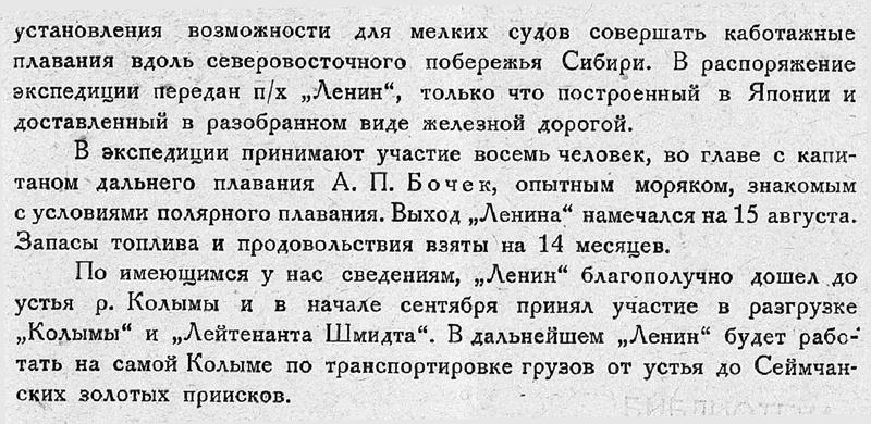 Наркомводом организована полярная экспедиция, которой поручено обследовать область от устья р. Лены до устья р. Колымы, с целью установления возможности для мелких судов совершать каботажные плавания вдоль северовосточного побережья Сибири. В распоряжение экспедиции передан п/х „Ленин", только что построенный в Японии и доставленный в разобранном виде железной дорогой.