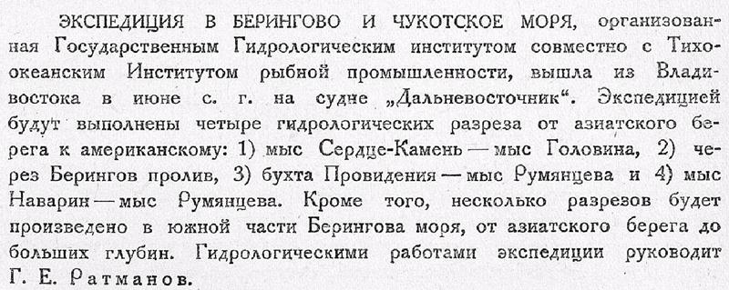 ЭКСПЕДИЦИЯ В БЕРИНГОВО И ЧУКОТСКОЕ МОРЯ, организованная Государственным Гидрологическим институтом совместно с Тихоокеанским Институтом рыбной промышленности, вышла из Владивостока в июне с. г. на судне „Дальневосточник". Экспедицией будут выполнены четыре гидрологических разреза от азиатского берега к американскому: 1) мыс Сердце-Камень — мыс Головина, 2) через Берингов пролив, 3) бухта Провидения — мыс Румянцева и 4) мыс Наварин — мыс Румянцева. Кроме того, несколько разрезов будет произведено в южной части Берингова моря, от азиатского берега до больших глубин. Гидрологическими работами экспедиции руководит Г. Е. Ратманов.