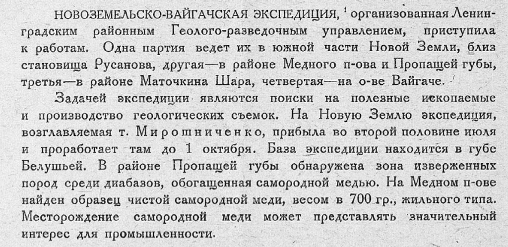 Задачей экспедиции являются поиски на полезные ископаемые и производство геологических съемок. На Новую Землю экспедиция, возглавляемая т. Мирошниченко, прибыла во второй половине июля и проработает там до 1 октября. База экспедиции находится в губе Белушьей. В районе Пропащей губы обнаружена зона изверженных пород среди диабазов, обогащенная самородной медью. На Медном п-ове найден образец чистой самородной меди, весом в 700 гр., жильного типа. Месторождение самородной меди может представлять значительный интерес для промышленности.
